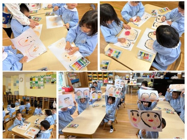 いつも遊んでいる仲良しのお友達、一緒のテーブルに座っているお友達、誰を描こうかな?お友達のお目目👀や髪型はどんなふうかな?としばらく考えてから、描いてみました🖍️