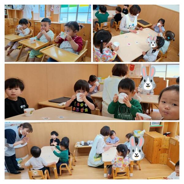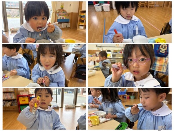 スプーンの持ち方がどの子も上手になっています🥄ご家庭でもしっかり持ち方のご指導をしていただいていることを感じます☺️いつもご協力ありがとうございます🩷