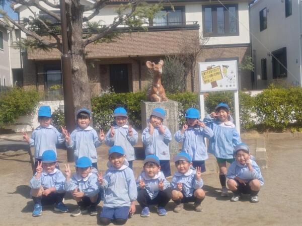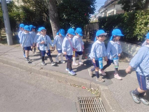 帰り道は手を繋いで来た道を戻っていると、高校生のお兄さんお姉さんに出会い手を振って少し小さな声で照れて「バイバーイ!」と言うと、「可愛いー🥰」と言われもっと照れてるさくら組さんでした🌸