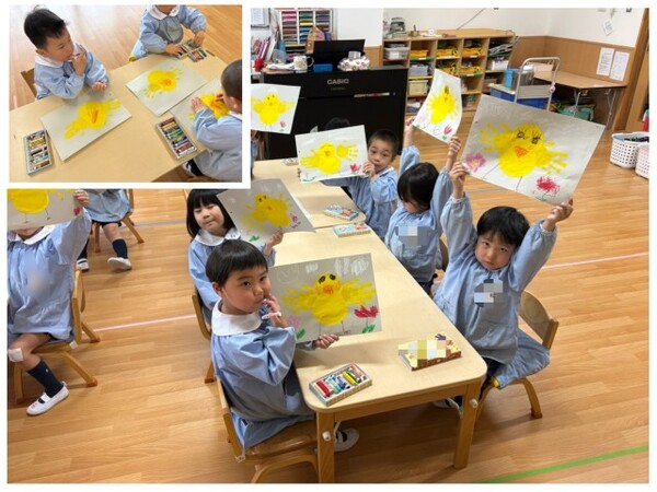 次の絵は、少し前に手形を取った紙を作品に仕上げます👐何になるでしょうか?と子どもたちに聞いてみましたがすぐにひよこ🐥‼️と答えられてしまいました🤭