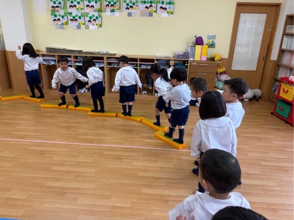 今日は園庭に出られなかったのですが、少し体を動かしたいなぁ、ということで、お部屋に丸太🪵のような平均台を準備しました😆