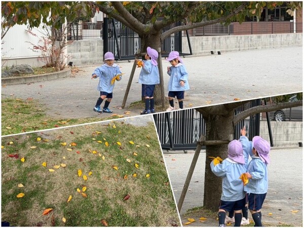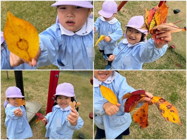 園庭の木の葉も変わり、子どもたちも色がかわった色鮮やかな葉を見て、何色がある?と探したり集めたり、、、