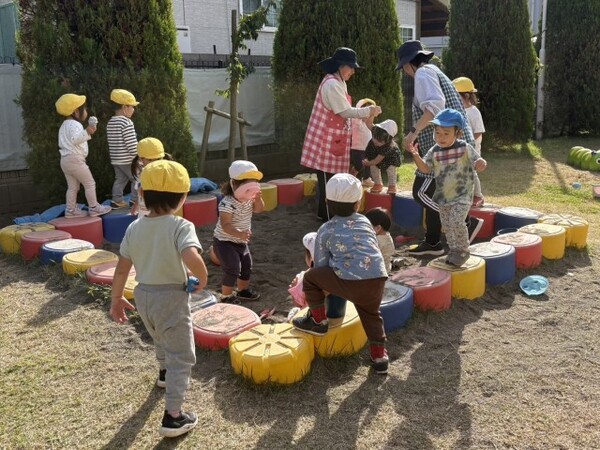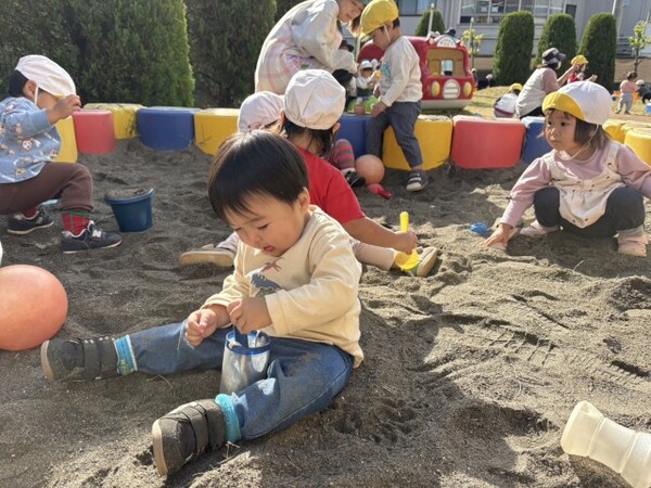 砂場の囲いの上をバランスを取りながら上手に歩く子もいれば、先生の手を握り慎重に歩く子もいて、砂場は子ども達の人気スポットです🎵