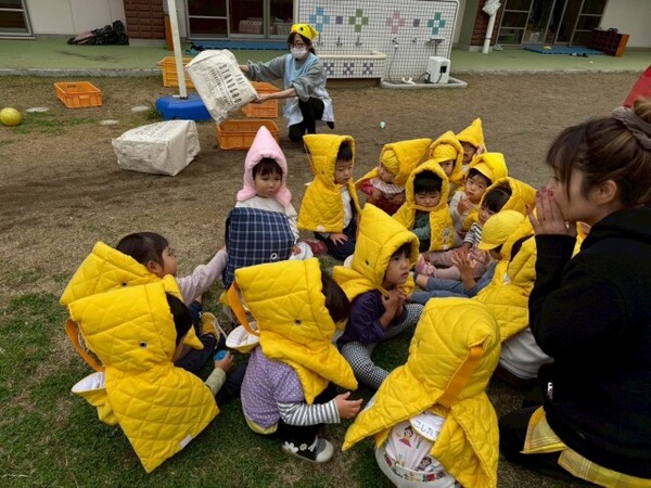 始めの頃は防災頭巾を被せると泣いてしまっていた子も、今では上手に被れるようになりました⭐️