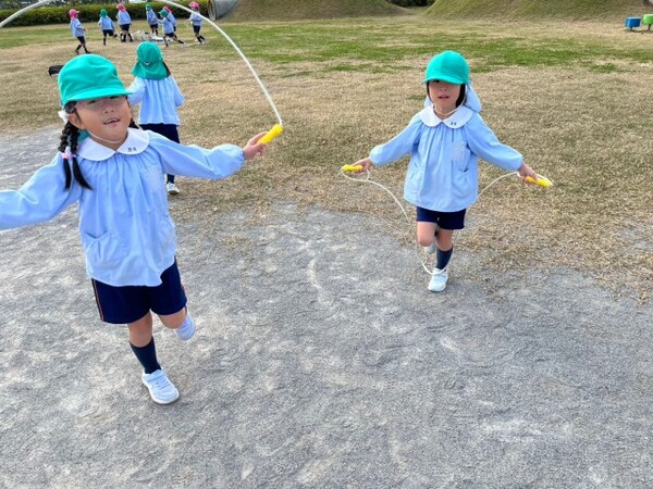 自分の番がくるまで目標の回数まで跳べるよう練習したり、難しい跳び方を友達と教え合ったりしています🐥「先生見てー!」とあちこちから声が聞こえてきます🌟みんなどんどん上達していますね😆体も温まります☀️