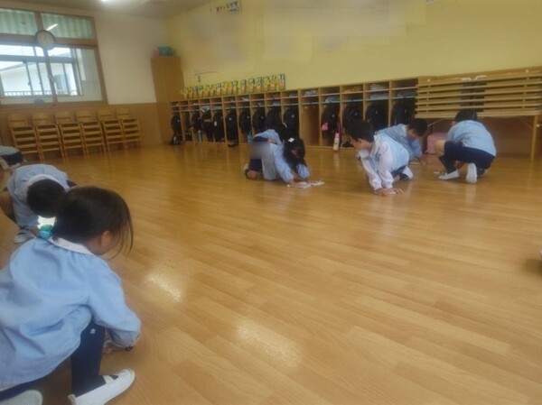 「きれいになーれ!」と言いながら汚れているところを雑巾できれいにしてると少しずつ空も晴れてきて、この後外に出てたくさん走って遊びました😊